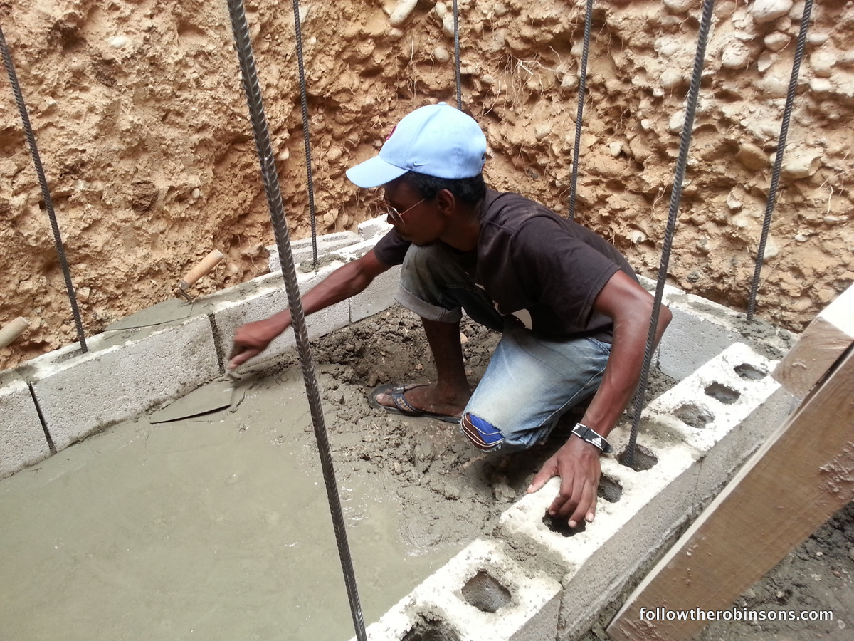 Local guys (and professionals) placing the cinder blocks in place and making the baffle wall for the latrine.